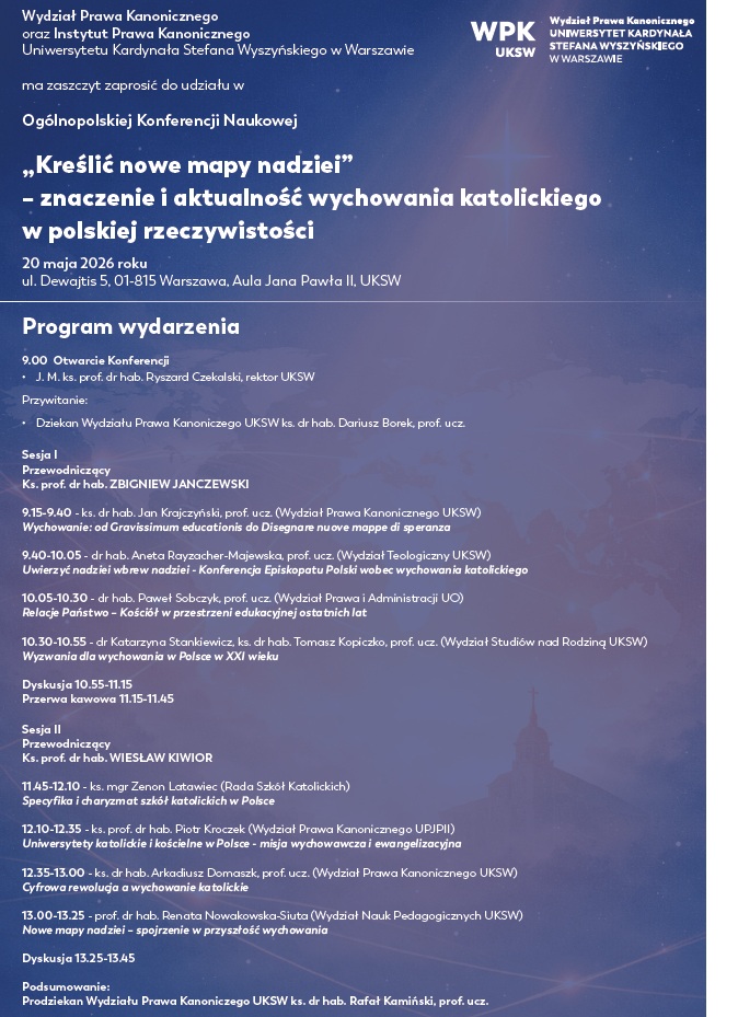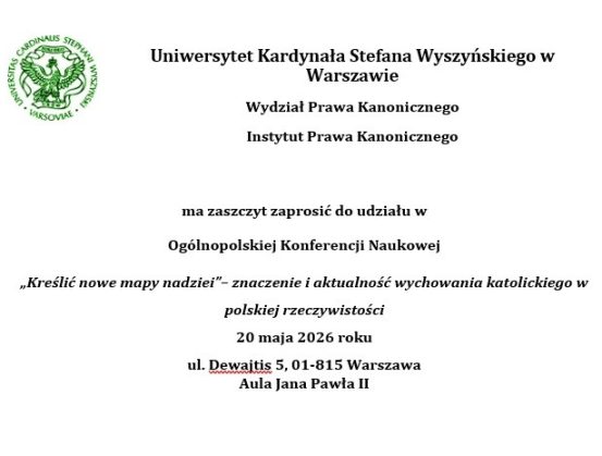 Zapraszamy Państwa do udziału w Ogólnopolskiej Konferencji Naukowej „Kreślić nowe mapy nadziei”– znaczenie i aktualność wychowania katolickiego w polskiej rzeczywistości, która odbędzie się w dniu 20.05.2026 roku, w Auli Jana Pawła II, na kampusie Dewajtis UKSW w Warszawie.